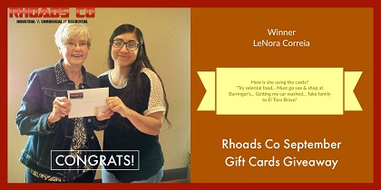 We would like to congratulate LeNora Correia for winning the $200 Rhoads Co September Gift Cards Giveaway. Her thoughts on Roswell... "Small town friendliness... Appreciates First Responders... Merchants want your business and treat you like friends!"